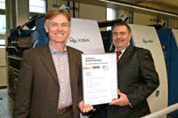 Über die Zertifizierung nach ProzessStandard Offsetdruck freuen sich Werner Seidel (l.), der Leiter des KBA-Kundenzentrums, und Marketingleiter Bogenoffset Jürgen Veil.