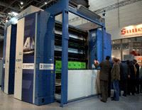 Dienstag 17. Juni 2008 - Erstmals präsentierten die KBA und das Druckzentrum Nordsee die Cortina 6/2, die weltweit erste dreifachbreite wasserlose Druckmaschine, auf der diesjährigen drupa der Öffentlichkeit. Gleich ins Auge fiel den Besuchern das großflächige Branding auf dem begehbaren Druckturm des Druckzentrums Nordsee, das als weltweit erster Käufer die Cortina 6/2 sein Eigen nennt. Aufgrund ihres wasserlosen Druckprozesses und der damit verbundenen hohen Produktqualität zog auch die Rotationsmaschine große Aufmerksamkeit auf sich. Sie zeichnet sich durch geringe Druckmakulatur und kürzere Rüstzeiten aufgrund eingesetzter automatischer Plattenwechsler aus und sorgt so für Flexibilität und Kostenreduzierung in der Produktion.