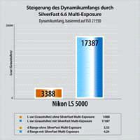Da mit SilverFast Multi-Exposure® ein deutlich gesteigerter Dynamikumfang von bis zu 4,2D erzielt wird, kann damit der maximale Dynamikumfang eines Kodachrome Dias von bis zu 3,8D voll ausgeschöpft werden. Ohne SilverFast Multi-Exposure® erreicht ein Nikon LS 5000 ED generell einen Dynamikumfang von nur 3,3D.