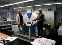 Drucker Markus Fritz (l.) und Peter Nowak (r.) vor der neuen Genius 52UV von KBA-Metronic