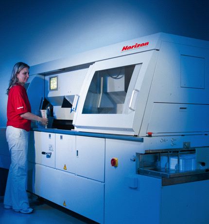 Einzigartig: Der BQ-470PUR mit Düsenauftragssystem ist der zurzeit einzige Klebebinder für mittlere und kleine Auflagen bis hin zum Einzelstück, der den nicht kennzeichnungspflichtigen MicroEmission-PUR-Klebstoff völlig problemlos und in perfekter Qualität verarbeiten kann. Null Makulatur wird so auch beim Verwenden dieses hochviskosen Klebstoffes zur Realität. Die Bindequalität ist hervorragend. Etwas anderes würden Horizon-Kunden auch gar nicht akzeptieren.