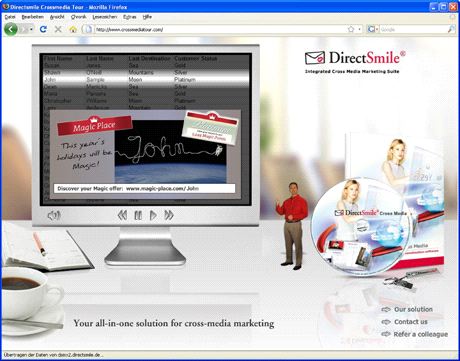 Falls Sie sich bereits vorab über DirectSmile Cross Media informieren möchten, bietet Ihnen unsere interaktive Präsentation unter www.crossmediatour.com einen guten Einblick.