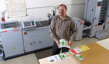 Die erste Horizon-Maschine bei Gräuler Druck war die MC-8-Zusammentragmaschine, die 2004 angeschafft wurde. Die MC-8 ist inzwischen ausgemustert, aber Gräuler ist Horizon treu geblieben. Vor einem Jahr hat er sich die Broschürenfertigungsstraße SPF/FC-200A von Horizon zugelegt, die nun das Herzstück der kleinen Druckerei ist. Denn ein wichtiger Teil des Geschäfts von Gräuler Druck ist die Druckweiterverarbeitung und hier insbesondere die Fertigung von Broschüren. »Wir werden auch kreativ tätig, wenn der Kunde das wünscht, aber hauptsächlich produzieren wir SD-Sätze und Broschüren mit Auflagen zwischen 1.000 und 5.000 Stück», beschreibt Gräuler eine Auswahl der angebotenen Produkte. »Für unser Produktportfolio ist die SPF/FC-200A genau die richtige Maschine. Sie arbeitet mit 4.800 Takten/h sehr schnell und ist sehr zuverlässig. Wichtig ist auch die einfache Bedienbarkeit durch die Horizon eigene Touch&work-Technologie. Selbst unsere Praktikantin konnte die Maschine nach kurzer Zeit bedienen», zählt Wolfgang Gräuler die Vorteile der Broschürenfertigungsstraße SPF/FC-200A auf. Auch Drucker Werner Büscher ist begeistert von der Horizon-Maschine: »Nicht nur die Qualität, sondern auch die Robustheit und Belastbarkeit der SPF/FC-200A haben mich beeindruckt. Außerdem ist der Service von Horizon vorbildlich. »Die Entscheidung zum Kauf der modernen Broschürenfertigungs-straße wurde nach intensiver Beratung mit Horizon-Gebietsleiter Hans- Peter Lehmann getroffen. »Die sachliche und engagierte Beratung der Horizon-Mitarbeiter vor aber auch nach dem Verkauf ist ein klarer Pluspunkt», lobt Wolfgang Gräuler.