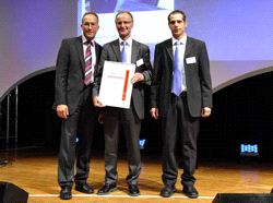 Bernhard Niemela, Chefredakteur „Deutscher Drucker“ (links) überreicht Zdenek Mazura (Mitte), Produktmanager und Daniel Höpli, Projektleiter der Seitenleimdüse SPN der Müller Martini Buchbinde-Systeme AG den Innovationspreis der Deutschen Druckindustrie in der Kategorie Weiterverarbeitung.