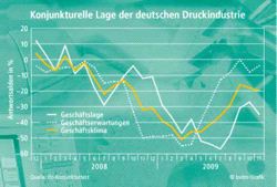 Die Beurteilungen zur aktuellen Geschäftslage haben sich wieder um 8 Prozentpunkte auf 35% verschlechtert, nachdem sie drei Monate in Folge besser geworden waren. Im November 2008 lag der Wert bei 12%. Gründe sind die erneute Verschlechterung der Einschätzungen zu den Produktions- und Nachfrageentwicklungen. Auch die Beurteilung der Auftragsbestände ist mit 47% wieder auf niedrigem September-Niveau angekommen. Ungefähr 36% der befragten Druckereien sind nach den Ergebnissen des ifo-Konjunkturtests im Auslandsgeschäft tätig. Ihre Beurteilung der Auslandsaufträge hat sich ebenfalls wieder um 10 Prozentpunkte verschlechtert.