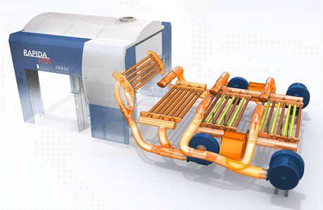 Die Abbildung zeigt die dreifache Auslageverlängerung einer Rapida-Großformatmaschine mit IR- und Thermolufttrocknern und Wärmerückgewinnung zur Verbesserung der Energieeffizienz