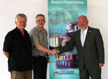 Freitag 16. Juli 2010 - Bernhard Erdmann und Gisbert Annuß, Geschäftsführer der Erdnuß-Druck GmbH in Sendenhorst, zeigten sich auf Anhieb von der erstmals auf der Ipex vorgestellten Komori Enthrone 29 begeistert.