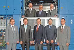 Vorne (v.l.) Lothar Hohmann (Wertpapierdruck), Dr. Andreas Göttker (Fertigung), stv. Vorstandsvorsitzender Claus Bolza-Schünemann, Thomas Potzkai (Gesamtmaschine), Klaus Christmann (Falzapparat). Hinten (v.l.) Bernhard Harant (Druckeinheit), Jürgen Weippert (Planung) und Stefan Heßler (Papierführung)