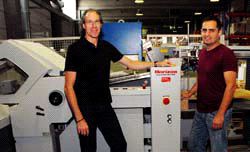 Geschäftsführer Reiner Vettermann und Bediener Oktay Ulug vor ihrer neuen, vollautomatischen Kombifalzmaschine AFC-746F aus dem Hause Horizon .