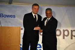 Siegerehrung - Matthias Lüke (li.), Leiter Produktion, Logistic-Mail-Factory, erhält den Preis von Ramesh Ratan (re.), President Pitney Bowes Document Messaging Technologies