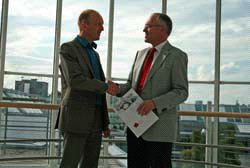 Vizepräsident der Hochschule Prof. Dr. Seeßelberg freut sich, dem Studiengangskoordinator Prof. Dr. Kreulich die Urkunde des Akkreditierungsrates übergeben zu können.