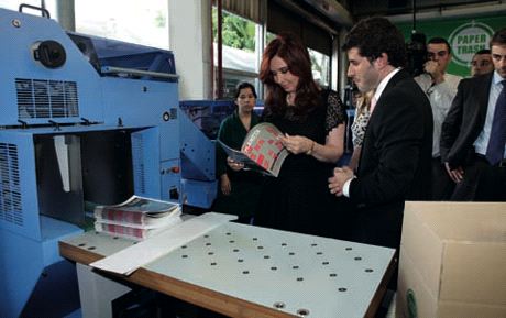 Mittwoch 07. Dezember 2011 - Die Druckerei Arcángel Maggio in Buenos Aires setzt auf das vollautomatisierte Sammelhefter-System Primera C140 von Müller Martini. Diesen wichtigen Schritt für die grafische Industrie Argentiniens würdigte Staatspräsidentin Cristina Fernández de Kirchner mit ihrer Präsenz an der Einweihung der neuen Maschine.