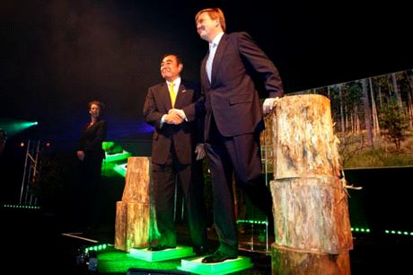 Shigetaka Komori, Präsident und CEO der FUJIFILM Corporation, und Prinz Willem-Alexander, Prinz von Oranien, hinterlassen symbolhaft "grüne Fußabdrücke", bevor sie die neue Anlage eröffnen.