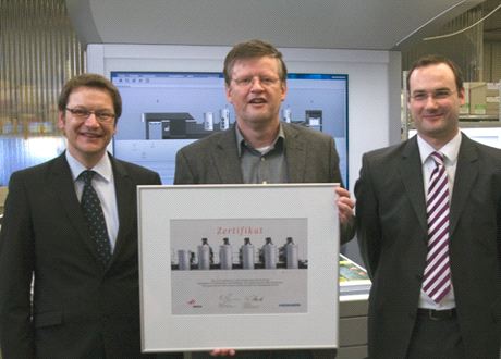 Bei einer kleinen Feier mit Kunden und Mitarbeitern überreichten Rainer Wolf (links), Produkt Marketing 70 x 100 bei Heidelberg, und Jörn Henselek (rechts), Leiter Heidelberg Vertrieb Ost, die Urkunde über das 1.000 Druckwerk der Speedmaster CX 102 an Thomas Löhnert von Löhnert Druck.