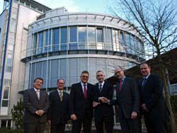 Martin Grude, Geschäftsführer der Wetzlardruck GmbH (3. von rechts), Siegmund Radtke, Verlagsleiter der Mittelrhein-Verlag GmbH und red.web-Verantwortlicher (3. von links), und Norbert Ohl, Geschäftsführer der ppi Media GmbH (2. von rechts), reichen sich zum Projektauftakt partnerschaftlich die Hände.