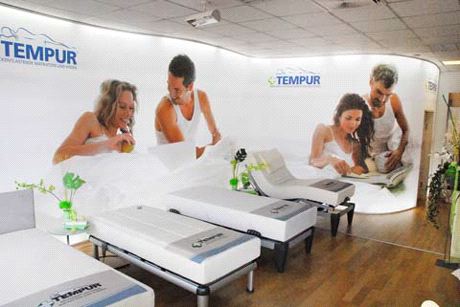 UVtex artist premium heavy ist ein lichtdurchlässiges (transluszentes) Textil und insbesondere für die Verwendung in Leuchtkästen (auch mit Spannrahmen und Kederschiene) geeignet. Zudem kommt es beim textilen Bauen bestens zum Einsatz. Gutes Beispiel für ein hinterleuchtbares Textil im großformatigen Digitaldruck ist der weltbekannte Matratzenhersteller Tempur mit seinem Shop-in-Shop-Konzept (siehe Foto). In großen Möbelhäusern und Bettenfachgeschäften wird ein Gerüst dabei mit einem solchen digital bedruckbaren XXL-Medium bespannt, und dieses wiederum von der Rückseite schön gleichförmig beleuchtet.
