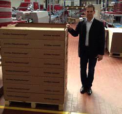 In der Vergangenheit musste bei veredelten Druckbogen mit hochauftragenden Lacken immer Rücksicht auf die Stapelhöhe genommen werden. Die einzelnen Paletten umfassten in der Regel maximale Bogenmengen von 250 bis 300. Dies hat zu einem erheblichen Transportaufwand geführt – selbst bei geringen Auflagen. Dank der von Achilles entwickelten Stapelkartonage ist jetzt damit Schluss: sie schützt die veredelten Druckbogen und erlaubt trotzdem die flexible Stapelung in beliebiger Höhe. So wird die benötigte Transportfläche auf dem Lkw deutlich verringert, was unnötige Fahrten und CO2 einsparen kann und so die Umwelt schont. Während bisher für 20 Paletten Druckbogen mit Relieflack-Veredelung mindestens ein 7,5-Tonner Lkw eingesetzt werden musste, genügen beim Einsatz von Achilles Stapelkartonage drei bis vier Paletten für dieselbe Menge Druckbogen und damit z.B. der Einsatz eines Sprinters. Auch Drucker und Buchbinder profitieren von der neuen Paletten-Verpackung. Sie können die Stellplätze um ein Vielfaches reduzieren und dadurch Raum für weitere Aufträge schaffen.
