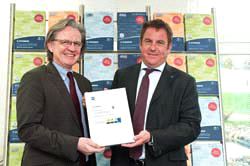 Der mit Abstand höchste Papierdurchsatz der getesteten Systeme verschiedener Hersteller erfolgte dabei auf Systemen von Konica Minolta, nämlich mit knapp 48.000 Schwarzweiß-Seiten auf dem bizhub 423 und 37.700 Farbseiten auf dem bizhub C452 – bei keinem einzigen Papierstau. Die entsprechende Bestätigung hat Konica Minolta im April an Torsten Froh, Geschäftsbereichsleiter Verkauf und Marketing bei Steinbeis Papier, überreicht.
