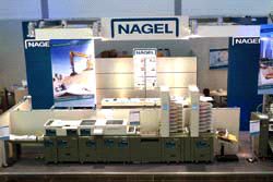Nagel präsentierte auf u?ber 100 Quadratmetern sein Produktportfolio aus den Bereichen Broschu?renfertigung, Heften, Zusammentragen, Bohren, Stanzen, Rillen und Falzen und Veredelung mit UV-Lack und Folie, sowie einige Neuheiten speziell fu?r den Digitaldruck.