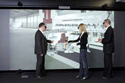Donnerstag 19. Juli 2012 - Entwicklungs- und Konstruktionsabteilungen mittelständischer Druckmaschinenhersteller nutzen vor Erschaffung ihrer physischen Konstrukte zunehmend 3D-Visualisierungen. Entwickler tauchen, vor einer immersiven Wand stehend, visuell in das dreidimensionale 1:1-Modell ein, stellen Ablaufszenarien in Echtzeit dar und kontrollieren es auf mögliche Planungsfehler.