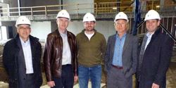Gruppenfoto im neuen, gerade im Bau befindlichen GWN-Druckzentrum (v.l.n.r.): Winfried Schenker (KBA-Vertriebsleiter), Duff Jamison (President von GWN), Evan Jamison (Plant Manager von GWN), Sam Wagner (President von Web Offset Services), Jochen Schwab (KBA-Vertriebsdirektor)