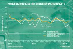 Freitag 31. August 2012 - Die Einschätzungen zur aktuellen Geschäftslage in der Druckindustrie haben sich wieder um 10 Prozentpunkte verbessert, sind aber mit -11 % der Antwortsalden noch immer negativ. Im August 2011 lagen sie bei -6 %.