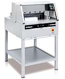 Rationelles und sicheres Arbeiten gewährleistet eine neu konzipierte IR-Lichtschranke im Arbeitsbereich auf dem Vordertisch. Auch die transparente Sicherheitsabdeckung auf dem Rücktisch sorgt für zusätzliche Bediensicherheit. Zahlreiche weitere Ausstattungsfeatures, die zur Serienausstattung gehören, garantieren einen hohen Bedienkomfort. Messer und Pressbalken können durch die zwei Druckpunkte der beiden zum Patent angemeldeten Bedientasten Easy-Cut entweder unabhängig voneinander oder gemeinsam bewegt werden. Optimale Sicherheit bei der Schnittauslösung ist durch die Zweihandbedienung mit Gleichzeitigkeitssteuerung und Wiederholsperre gegeben.