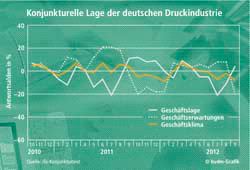 Freitag 28. September 2012 - Die Einschätzungen zur aktuellen Geschäftslage in der Druckindustrie haben sich um weitere 15 Prozentpunkte verbessert und liegen mit +4 Prozent der Antwortsalden nun über der Nulllinie. Im September 2011 lagen sie bei +11 Prozent.