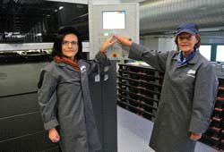 Qualität auf Knopfdruck: Gemeinsam nehmen zwei der Gesellschafterinnen die neue Sechsfarben-Druckmaschine bei colordruck Baiersbronn in Betrieb. Links im Bild Marlis Schwedes, rechts im Bild ihre Schwester Renate Bengel.