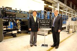 Yoshiro Ohno, Präsident von Taise, und KBA-Vertriebsdirektor Dietmar Heyduck (r.) bei der Kundenabnahme der Achtfarben-Rapida 106 in der Montagehalle des KBA-Werkes Radebeul