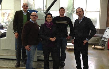 Die Genius 52UV bei Stiels Werbedruck GmbH & Co. KG in Nettetal. Ralf Engels, Firma Heinrich Steuber, Stefan Stiels, Geschäftsführer Stiels-Werbedruck, Sandra Ulsamer, Gebietsverkaufsleiterin KBA-MePrint, Sven Tappesser, Drucker Stiels-Werbedruck und Jakob Stiels, Geschäftsführer Stiels-Werbedruck (v.l.n.r.).