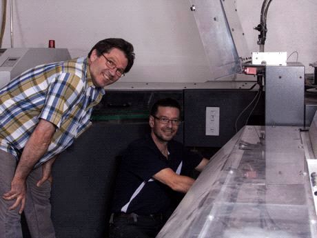 Geschäftsführer Michael Stigler und Buchbinder Peter Gallecker beim Einstellen des neuen Sammelhefters  Heidelberger ST 400 (v. l.)