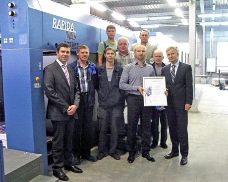 Zum Produktionsstart der Rapida 105 trafen sich das Team von Polygraph Print mit Geschäftsführer Valery Piwovarov (4.v.l.) und KBA-Vertriebsdirektor Sven Strzelczyk (r.)