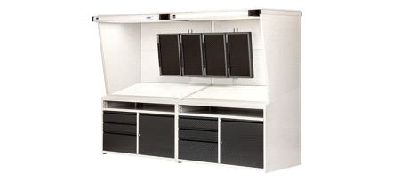 Beliebig erweiterbar ist die Virtual proofStation Side-by-Side BASIC. Mit der Erweiterungsstation Side-by-Side XT kann die normgerecht beleuchtete Fläche der Virtual proofStation Side-by-Side auf 200 x 70 cm verdoppelt werden. Damit einher geht auch eine Anpassung der Monitorausstattung. So können mit der Monitorhalterung XT zwei zusätzliche Monitore im Quer- oder Hochformat aufgenommen werden. Die SPcontrol mit USB-Schnittstelle und Betriebsstundenzähler regelt die Lichtdimmung der Basis- und Erweiterungsstation, womit sich das Abmusterungslicht der JUST moduLight auf die Helligkeit der Monitore für Softproof-Anwendungen dimmen lässt. Tastaturauszug, Ventilatorbelüftung zur PC-Kühlung und ein Unterschrank mit reichlich Stauraum für Druckutensilien, gehört zur Standardausstattung jeder Virtual proofStation Side-by-Side BASIC. Die Seiten- und Rückwände sind wie bei allen anderen Large-Format-Lösungen auch, in Munsell N7 ausgeführt, was eine neutrale Abmusterung sicherstellt.