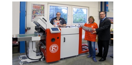 Donnerstag 23. April 2015 - Druckerei Clasen in Düsseldorf demonstriert Fußballbegeisterung auch bei der neuesten Investition im Bereich der Druckweiterverarbeitung.
