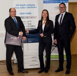 Montag 25. Januar 2016 - Angelika Peled, Leiterin für Kommunikation bei der Antalis GmbH, und Printdata-Geschäftsführer Frank Siegel übergaben im Kompetenz-Center für digitale Drucklösungen den Sonderpreis des antapoints* Wettbewerbs 2015 an Frank Fischer, Inhaber und Geschäftsführender Gesellschafter des Druckhauses Frank Fischer GmbH. Der Gewinn war eine von Antalis und Printdata gesponserte Digitaldruckmaschine Xerox Colour C60 inklusive Printserver, die noch vor Weihnachten im Druckhaus Frank Fischer in Haan bei Düsseldorf in Betrieb genommen wurde.