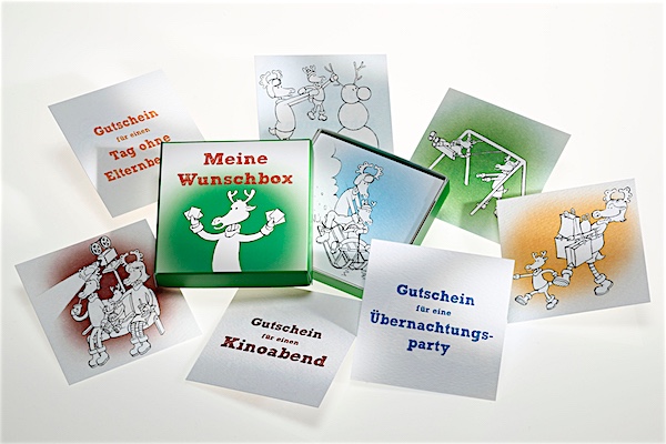 Insgesamt ist der Kalender sogar mit 36 Gutscheinkärtchen gefüllt, so bleibt der Adventskalender abwechslungsreich und kann auch in den Folgejahren eingesetzt werden. Der Adventskalender ist mit recycelten Papieren hergestellt. Er ist mit 100 Prozent mineralölfreien Bio-Farben bedruckt. Alle eingesetzten Materialien sind einfach und natürlich und können unbedenklich in den Wertstoffkreislauf zurückgeführt werden. Sämtliche Papiere sind von Antalis, der führenden europäischen Großhandelsgruppe für Kommunikationsmedien. Dazu Jürgen Schoch, Sales Manager Premiumpapier & Leiter Backselling: „Es erstaunt mich immer wieder aufs Neue, welch kreativen Ideen mit Papier entstehen.“ Druck und Verpackung sind von Druckpartner in Essen. Dazu Gerhard Florian, Gesellschafter und Betriebsleiter von Druckpartner: „Gerade bei Produkten für Kinder ist es wichtig mit mineralölfreien Farben zu drucken. Bei diesem Adventskalender können die Eltern sicher sein, dass die Farben für ihr Kind völlig unbedenklich sind.“