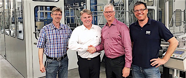 Kurz nach der Vertragsunterschrift in der Druckerei von B&K Offsetdruck: v.l.n.r. Werner Stimmler, Kaufmännischer Leiter B&K Offsetdruck; Reiner Dluschek, KBA-Vertriebsleiter; Jörn Kalbhenn, Geschäftsführer B&K Offsetdruck; Hans Geideck, Technischer Leiter B&K Offsetdruck