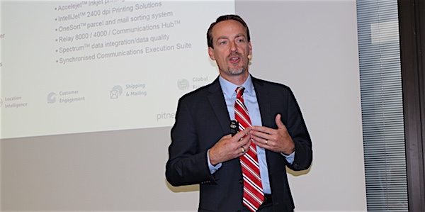Grant Miller, Vice President Global Strategic Product Management Pitney Bowes skizzierte die wesentlichen Leistungsmerkmale der neuen Version des AcceleJet auf der drupa Pressekonferenz