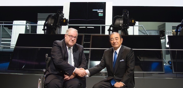 Die Vorstandsvorsitzenden von Fujifilm und Heidelberg (Shigetaka Komori (re.) und Dr. Gerold Linzbach) auf der drupa 2016 bei der Weltpremiere der Heidelberg Primefire 106 powered by FUJIFILM Inkjet-Technologie.