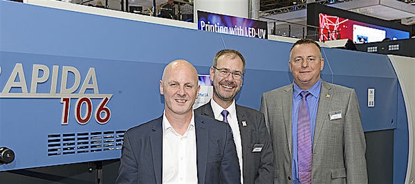 Donnerstag 09. Juni 2016 - Das Management von J Thomson Colour Printers im schottischen Glasgow bestellte auf dem KBA-Messestand eine Sechsfarben-Rapida 106 mit Lackturm und LED-UV-Trocknung und eine konventionelle Zehnfarben-Rapida 106 mit Bogenwendung für die 5 über 5-Produktion. Gleichzeitig wechselte das Unternehmen mit dieser Großinvestition den Druckmaschinenlieferanten.