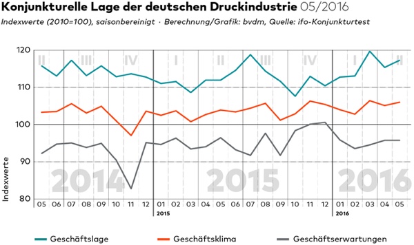Die Stimmung in der deutschen Druck­industrie hellte sich im Mai 2016 wieder auf. Der saison­bereinigte Index­wert zur Beurteilung der aktuellen Geschäfts­lage ist gegenüber dem Vormonat um 1,9 % auf 117,1 Zähler gestiegen. Gegenüber dem Vorjahres­wert sind das 5,3 Prozent­punkte mehr. Damit wird eine positive Tendenz in der Beurteilung der Geschäfts­lage deutlich. Denn gegenüber den Vorjahres­werten war der Mai-Anstieg der fünfte in Folge.
