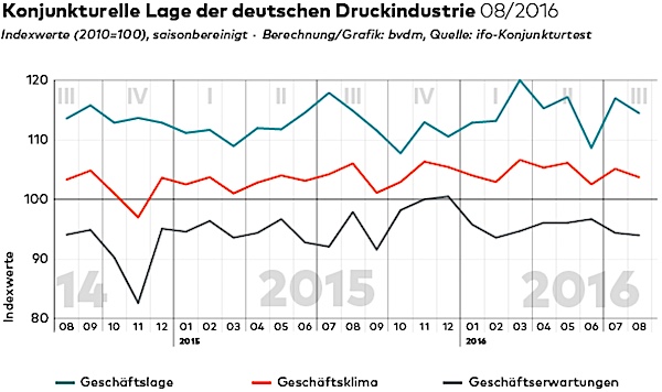Die Entwicklung des saisonbereinigten Geschäftsklimaindexes der Druckindustrie – ein geometrisches Mittel der Geschäftslagebeurteilung und der Geschäftserwartungen – war im August 2016 mit 1,3 % unter Vormonatsniveau. Der Index erzielte einen Stand von 103,6 Zählern. Das Vorjahresniveau wurde um 2,3 % unterschritten.