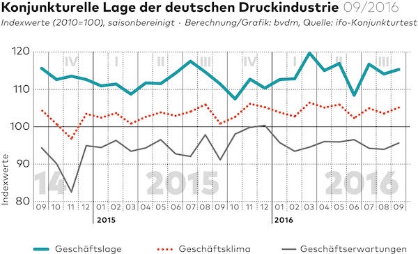 Die Entwicklung des saisonbereinigten Geschäftsklimaindexes der Druckindustrie – ein geometrisches Mittel der Geschäftslagebeurteilung und der Geschäftserwartungen – war im September 2016 um 1,5 % über dem Vormonatsniveau. Der Index erzielte einen Stand von 105,2 Zählern. Das Vorjahresniveau wurde um 4,3 % überschritten. Im Schnitt der ersten drei Quartale 2016 ergab sich beim aktuellen Wert von 104,5 Punkten ein Plus von 1,4 %.