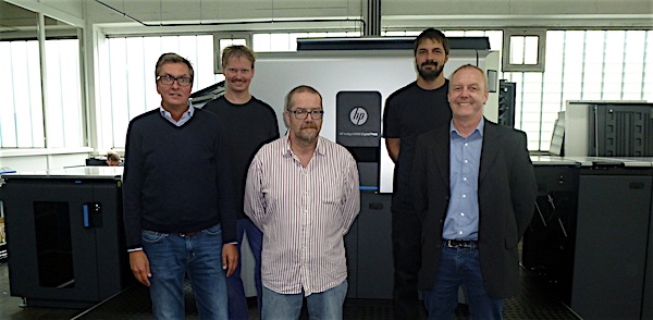 HP Indigo 10000 bei Spintler. v.l.: HP-Account-Manager Andreas Durdel, Operator Wolfgang Wunderlich, Leiter Digitaldruck Martin Feiler, Operator Florian Zametzer, Geschäftsführer Thomas Leckert