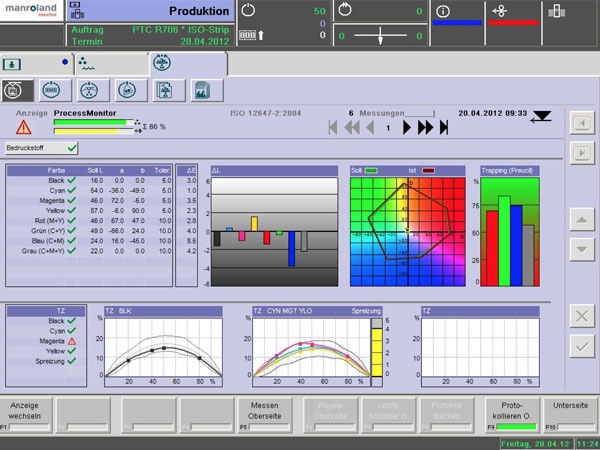 Die mit der Vorstufe mittels Integration Pilot smart vernetzte Maschine erhält die Daten zur Farbvoreinstellung vollautomatisiert. Um den hohen Qualitätsanspruch von Hauserpresse zu erfüllen, werden die gedruckten Bögen mittels Inlinefarbmessanlage fortlaufend gemessen. Dazu kommen besondere Softwaremodule zur Prozessanalyse: