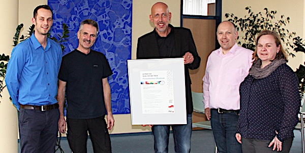 Übergabe der PSO-Urkunde am 24.02.2017 in den Räumen von DruckArt in Kaufering. v.l.:Florian Schöck (Produktionsleitung DruckArt),Peter Stahl (Meister Medientechnologie Druck, Fa. DruckArt), Dirk Müller (printXmedia Süd GmbH), Andreas Seitz (Standortleitung DruckArt) und Stefanie Sperber (Druckvorstufenleitung DruckArt)