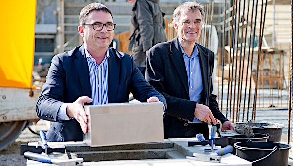 Claus Bolza-Schünemann, CEO der Koenig & Bauer AG (r.) und Christoph Müller, Geschäftsführer von KBA-Digital & Web und KBA-Flexotecnica, bei der Grundsteinlegung für das neue Democenter