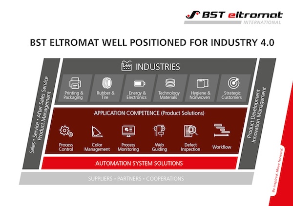 Freitag 24. März 2017 - BST eltromat International, Hersteller von Qualitätssicherungssystemen für die bahnverarbeitende Industrie, präsentiert auf der ICE Europe praktische Beispiele für die erfolgreiche Umsetzung von Industrie 4.0. Auf dem Messestand in Halle A6, Stand 386, veranschaulicht das Unternehmen, wie verschiedene Produkte aus dem Produktportfolio der BST eltromat Gruppe gemeinsam in ein Protokoll arbeiten und somit dem Maschinenbediener noch aussagekräftigere Informationen zu seiner Produktion liefern.