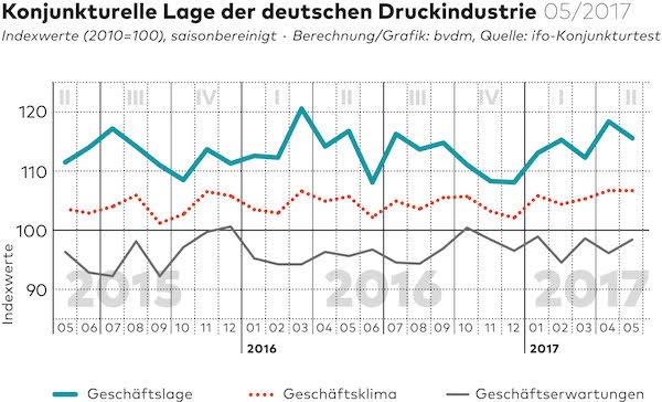 Mittwoch 07. Juni 2017 - Das Geschäftsklima in der Druck- und Medienbranche blieb im Mai 2017 auf dem Niveau des Vormonats. Der Indexstand von 106,7 Zählern steht somit erneut für eine gegenüber den Vorjahren gute Stimmung in der Branche. Das Plus von 1,0 % gegenüber dem Vorjahresstand stützt diese Wahrnehmung.